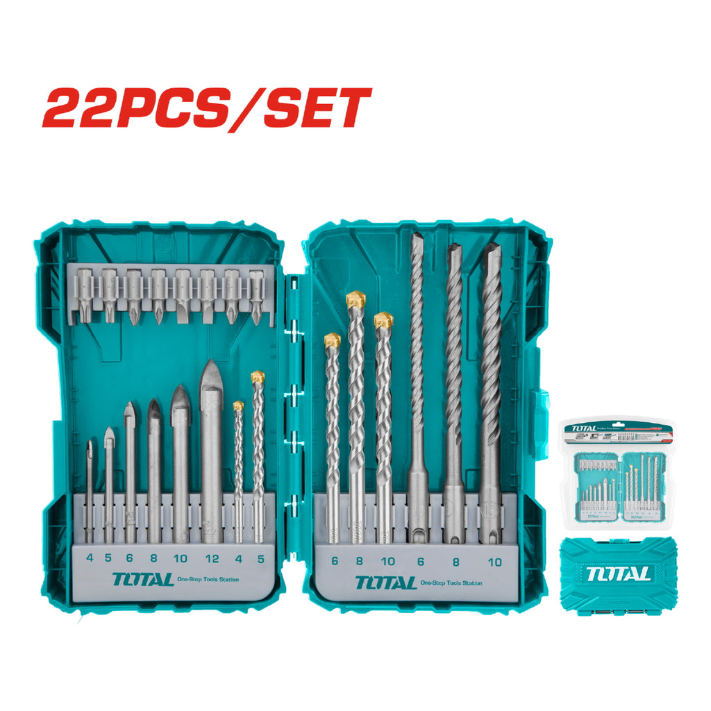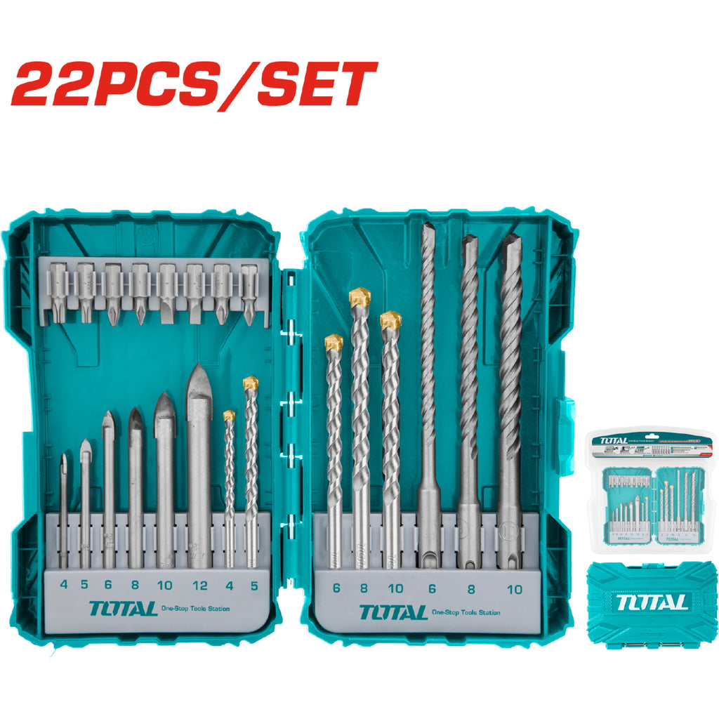 Juego de 22 piezas de brocas y destornilladores para taladro. 8 brocas de destornillador de 25 mm. 6 brocas para vidrio de 4,5,6,8,10,12mm. 5 brocas para mampostería 4,5,6,8,10 mm. 3 brocas SDS plus brocas para rotomartillo de 6 X 160mm, 8 X 160mm, 10 X 160m.