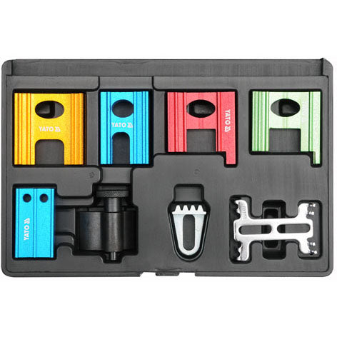 Yato Juego De Bloqueo De Distribucion, 8 Piezas. 5 Piezas De Bloqueo De Distribucion Para Opel, Saab, Rover, Material: Aluminio Anodizado; 1 Pieza Del Juego De Bloqueo De Distribucion Para Vw, Fostato Negro; 1 Pieza De Herramienta De Sujecion De Volant