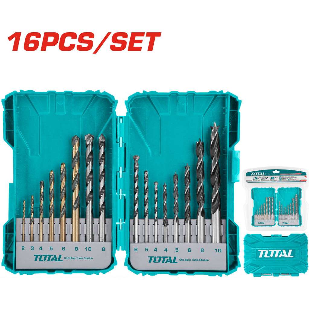 Juego de brocas de 16 piezas. Incluye 6 brocas para metal: 2,3,4,5,6,8mm. 5 brocas para concreto: 4,5,6,8,10mm. 5 Brocas para madera: 4,5,6,8,10mm.