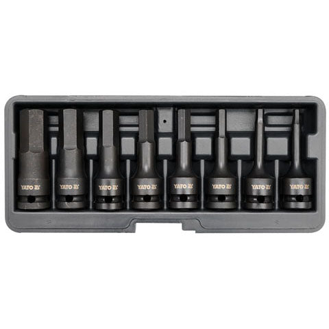Yato Juego De Dados De Punta De Impacto Hexagonal. 8 Piezas: 6, 7, 8, 10, 12, 14, 17, 19 Mm, 1/2'', Material: Crmo Scm-440 Con Acabado Negro Fosfatado, Longitud: 78 Mm, Templado, Acabado Negro Fosfatado, Impresion Laser: Logotipo Y Tamaño Juego De Dados