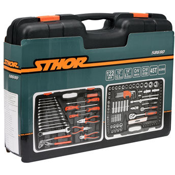 Sthor Juego De Herramientas (1/2'', 1/4”, 122 Piezas). Todos Los Dados: 6 Puntas, Material: Acero Al Carbono, 2 Tonos Con Moleteado En Torno, Regular (1/2''), Din 3121, Sistema As-Drive, Longitud: 38/42 Mm, 15 Piezas (12 Mm, 13 Mm, 14 Mm, 15 Mm, 16 Mm, 1