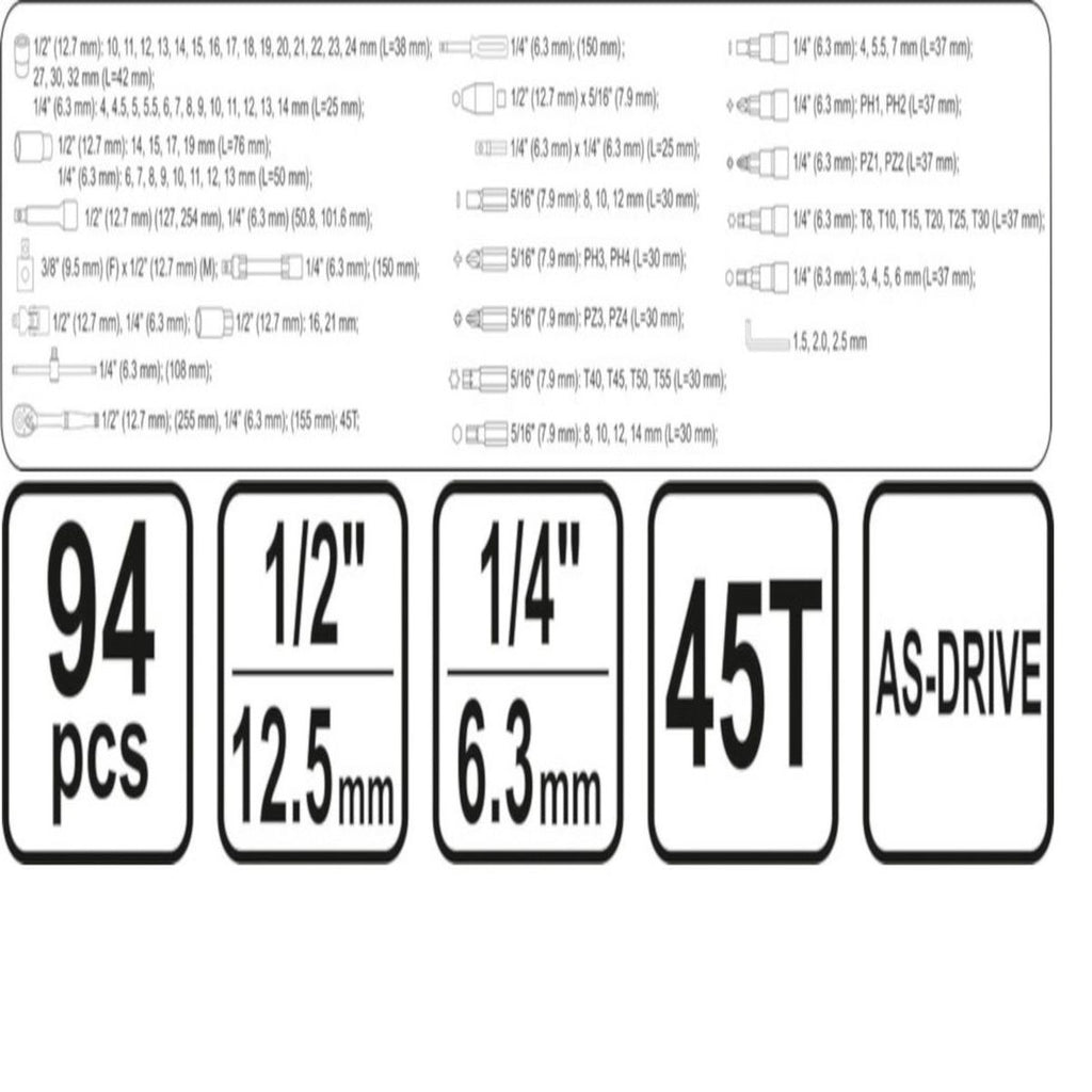 | Características | Juego de Herramientas 94 piezas. AS-DRIVE, DIN 3121 |