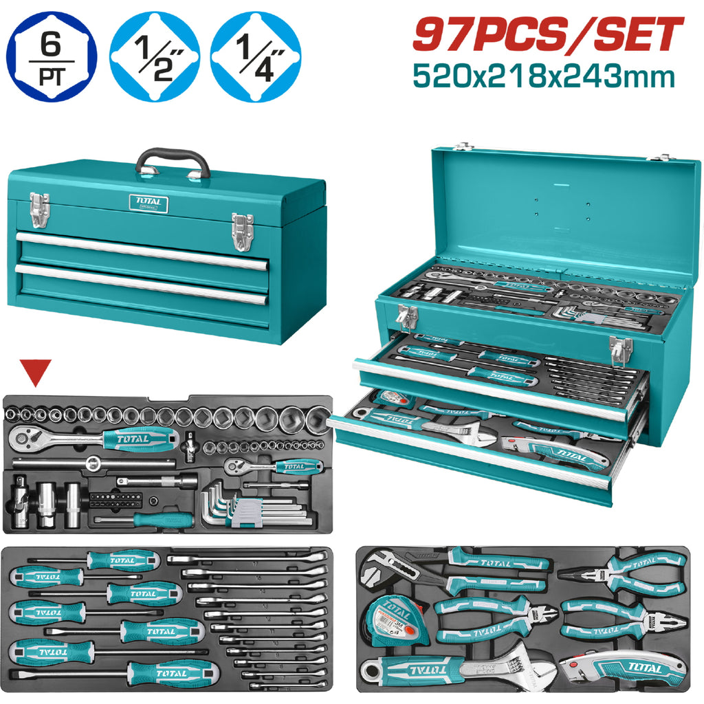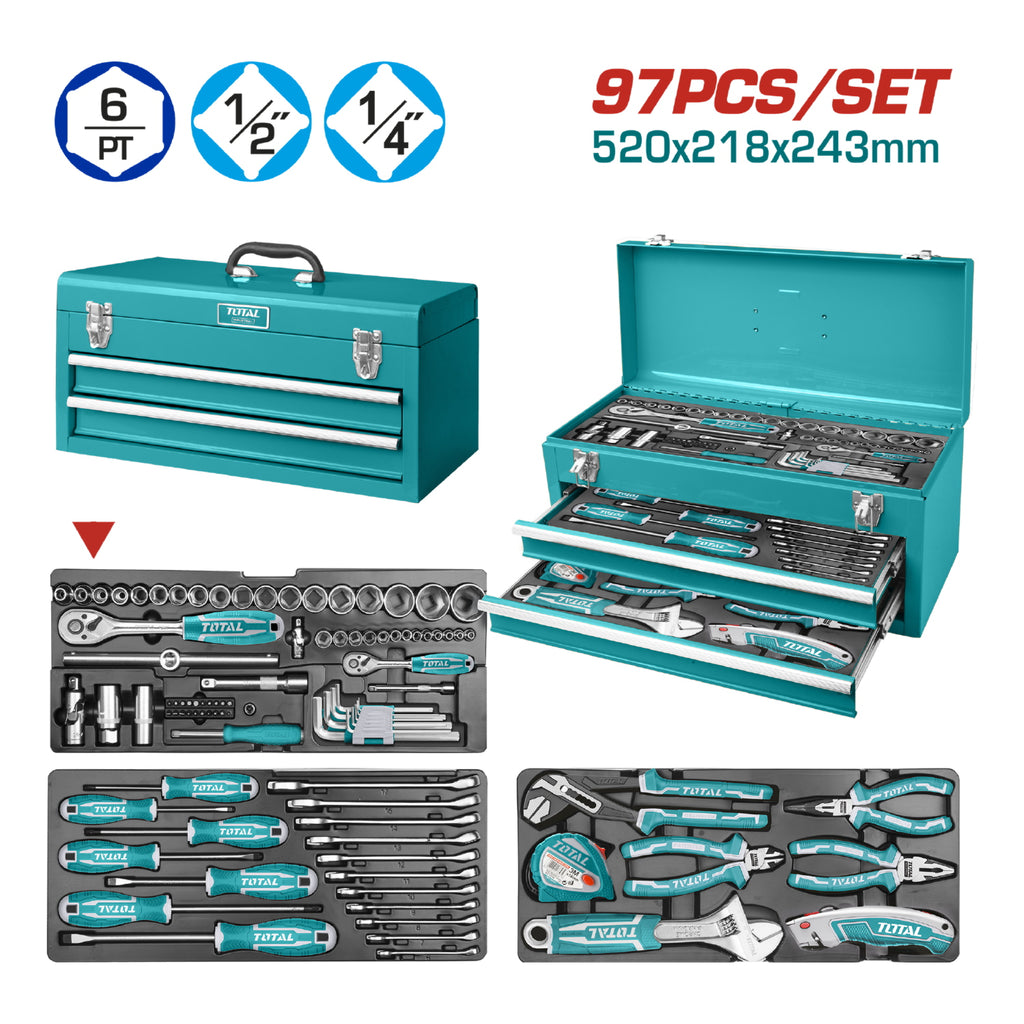 Juego de herramientas de 97 piezas en la caja de herramienta. Tamaño 520*218*243mm, Bandeja 506*215*63mm, Gavetas 449*196*54mm, Espesor Gabinete: 0.8mm / gavetas: 0.6mm. Presentación caja de cartón.