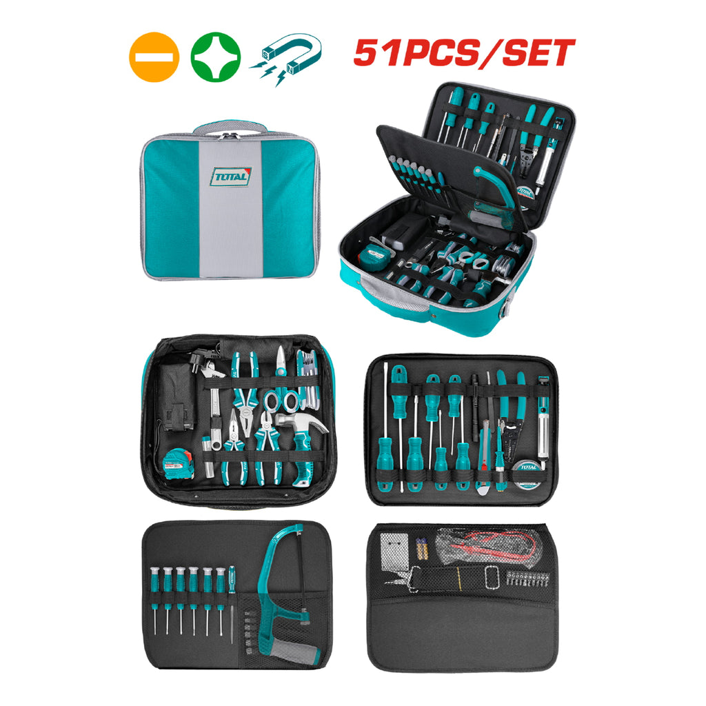 Juego de herramientas para telecom. de 51 piezas. Incluye: 1 Multímetro digital. 1 llave ajustable de 8''. 1 alicate de punta larga de 6''. 1 alicate de corte diagonal de 6''. 1 alicate de comnbinacion de 7''. 1 alicate corta alambre de 6''. 1 llave hexgonal. 3 destornilladores planos 3 x 75mm, 5 x 100mm, 6 x 150mm. 3 destornilladores phillips #0 X 75mm, #1 x 100mm, #2 x 150mm. 1 cuchilla de corte a presión. 1 bomba desoldador de estaño. 1 mini martillo de orejas. 1 cinta metrica de acero. 1 lapiz soldador eléctrico para estaño. 1 soporte para el lapiz soldador de estaño. 1 Lápiz Tester de 190 mm. 1 Linterna. 1 alambre de soldadira de 10g. 1 mini sierra. 1 cinta aislante de PVC. 6 sockets de 1/4'' hexagonales 5mm 6mm 8mm 9mm 10mm 11mm. 1 socket adaptador de 4-6 mm (25 mm). 1 mago magnetico de 100 mm. 1 lima de acero media caña 3x140 mm. 1 Pinzas 125 mm. 6 Destornilladores de precisión. 1 tijeras de electricista. 10 brocas de destornillador PH1-PH2-PZ1-PZ2-SL4-SL6-Hex4-Hex5-T20-T25.