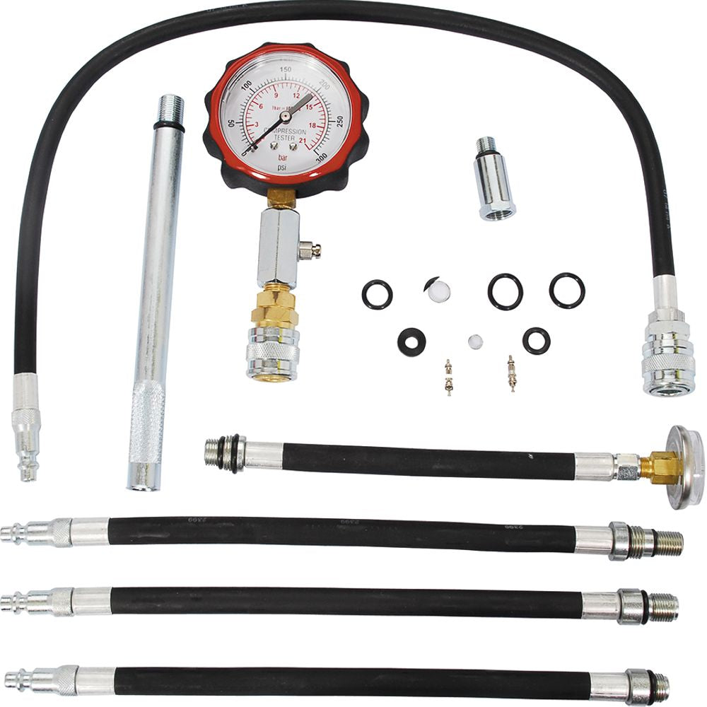 -Con el juego para medición de compresión automotriz usted realiza e inspecciona con rapidez y precisión la compresión de motores a gasolina dando lecturas confiables en kg/cm2 o en psi. -Piezas: 9