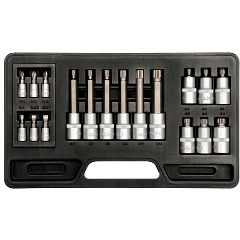 Juego De Puntas De Dados (18 Piezas: Ph, Planas, Estriadas) (Ph1, Ph2, Ph3, Sl: 4, 5.5, 6.5); 6Pcs Of Socket Bits, 1/2'', Length 5 0Mm (M5, M6, M8, M10, M12, M14); 6Pcs Of Socket Bits, 1/2'', Length 100Mm (M5, M6, M8, M10, M12, M14); Din 3120 / Aisi S2