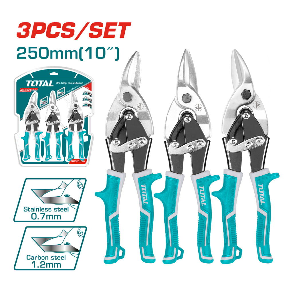 Juego de Tijeras de Aviacion de 250 mm (10'') de 3 piezas. CrMo. (izquierda, recta, derecha). Espesor máx. De corte: Acero al carbono ≤ 1.2 mm. Acero inoxidable ≤ 0.7 mm.