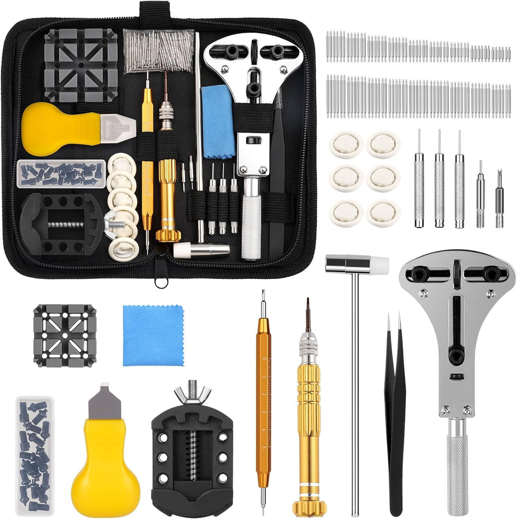 El juego de reparación de relojes de alta calidad es perfecto para profesionales y principiantes para hacer tareas comunes como abrir la parte trasera del reloj, ajustar la correa, cambiar las pilas del reloj, juntas, ajustar las correas y más.