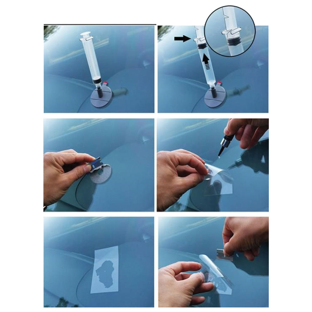 Kit de Reparacion para Parabrisas o cualquier Vidrio de Ventana de Auto. Tiempo de secado de 30 a 50 min. Evita la extension de las grietas o fisuras. Debe realizarce la reparacion lo mas rapido posible, antes que se contamine o se llene de agua la fisu