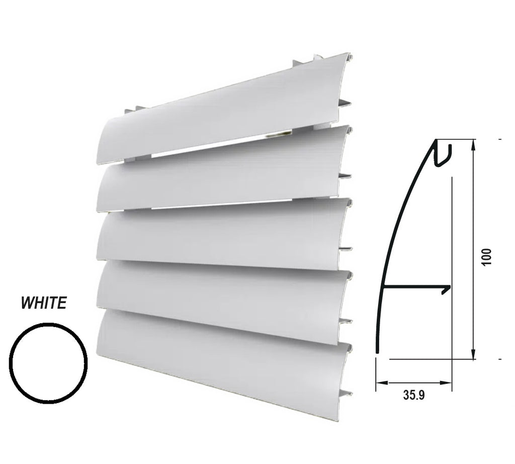 Lama Louver Curva Blanco para clipar en marco U127 Ancho 100x35x1mm. Espesor 1.0 mm. Largo 5.85 mts. Acabado Pintado Blanco 70 - 120 Micron