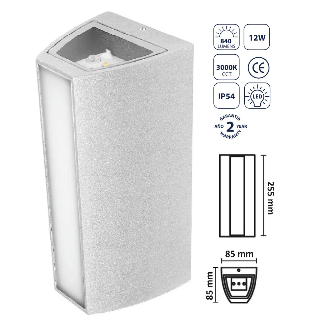 LAMPARA DE PARED EXTERIOR BLANCA LED 12W 30K lámpara de pared exterior blanca con tecnología LED, 12W de potencia y 3000 K de temperatura de color calida y 840 lumens , es una opción eficiente y versátil para iluminar áreas exteriores, proporcionando una iluminación brillante y de bajo consumo energético.Tamaño de 85*255 milimetros, material de aluminio, voltaje 110-240V 50-60Hz.