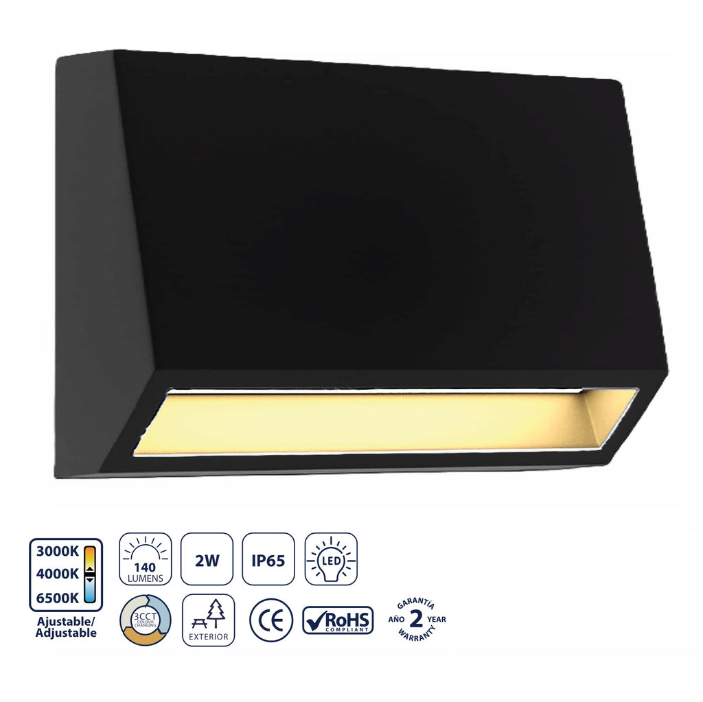LAMPARA DE PARED EXTERIOR NEGRA LED 2W CCT lámpara de pared exterior negra LED con una potencia de 2W, 140v lumens y tecnología CCT , es un accesorio versátil y duradero que proporciona iluminación efectiva y estética en áreas exteriores, mientras agrega un toque de estilo al exterior del edificio. Además, la capacidad de ajustar la temperatura de color como luz como cálida, neutral y fría ofrece mayor flexibilidad para adaptar la iluminación a diferentes entornos y preferencias. Este tipo de lámpara es ideal para proporcionar iluminación funcional y decorativa en áreas exteriores como entradas, porches, patios, escaleras, terrazas, jardines o balcones.Material ABS, voltaje 110-130V 50-60Hz. tamaño de 100*70*33 milimetros.