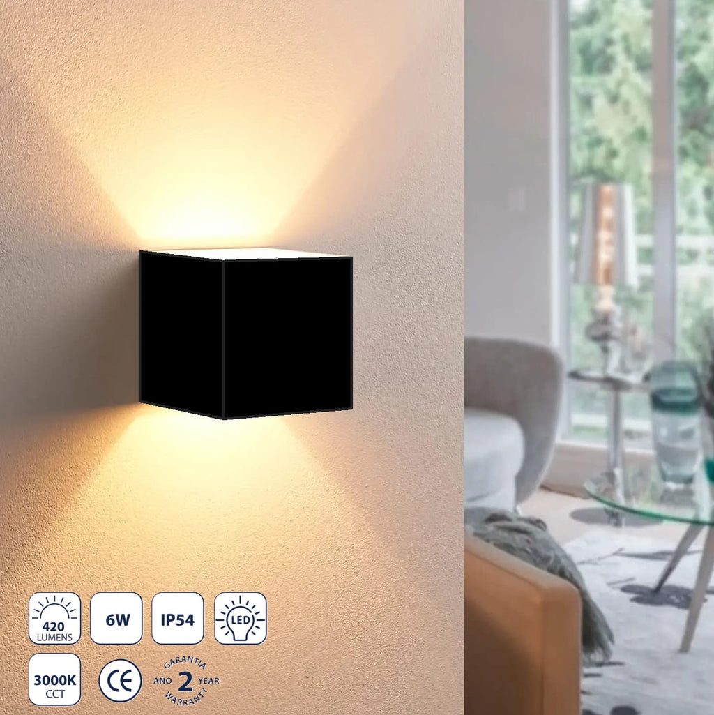 LAMPARA DE PARED EXTERIOR NEGRA LED 6W 30K lámpara de pared exterior negra con tecnología LED, 6W de potencia y 3000K de temperatura de color calida, 420 lumens, es una opción eficiente y versátil para iluminar áreas exteriores, proporcionando una iluminación brillante y de bajo consumo energético. Tamaño 110*110*110 milimetros, voltaje 110-240V 50-60Hz, material de aluminio de alta calidad.