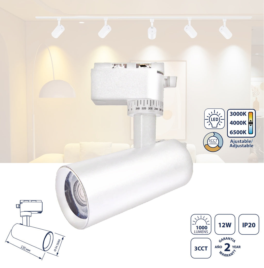 LAMPARA DE RIEL BLANCA LED 12W CCT lámpara de riel LED de 12Watts, 1000 lumens con tonos CCT 3000K cálido, 4000K neutra, 6500K fría y color blanco es una opción versátil y moderna para la iluminación de espacios comerciales o residenciales, ofreciendo flexibilidad en la iluminación, eficiencia energética y un diseño estético atractivo. Tamaño 54.5*135 milimetros, voltaje 110-240V 50-60Hz, material aluminio, dirigible, angulo de 24 grados. Las lámparas de riel LED son ideales para iluminar áreas de exposición en tiendas minoristas, galerías de arte o museos, así como para resaltar elementos decorativos en espacios residenciales como salas de estar, comedores o pasillos.