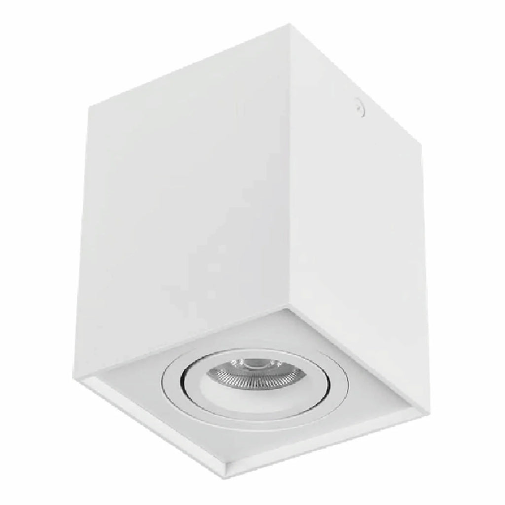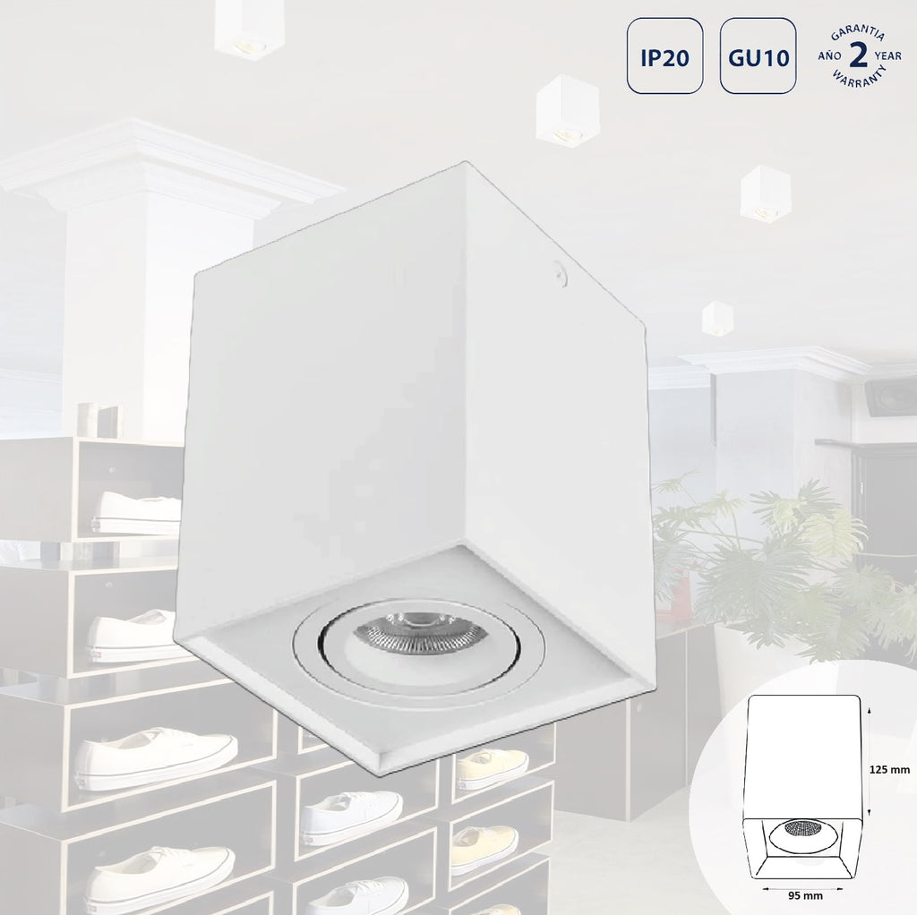 LAMPARA DE TECHO BLANCA ALUMINIO 1XGU10 de superficie con un diseño simple y cuadrado con instalación sencilla, dirigible y con un voltage de 110-240V 50-60Hz, Tono de Color Blanco con un cuerpo de policarbonato que disipa altas temperaturas. Medidas de 95*95*100 Milimetros. Base GU10 No incluye Bombillo