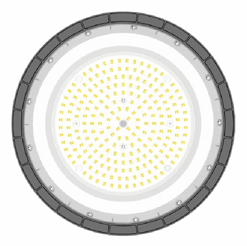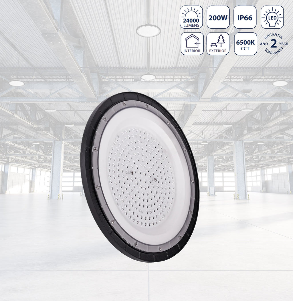 LAMPARA DE TECHO LED HIGH BAY 200WATTS 6500K son una solución eficiente y efectiva para iluminar grandes espacios interiores con techos altos, proporcionando una iluminación potente, uniforme y duradera mediante la tecnología LED. Medias de 360*360*30 milimetros con luz fría, Voltage de 110-277V 50-60Hz con material de Aluminio de alta calidad para dispersar las altas temperaturas. Posee 200 Watts y 24000 lumenes.