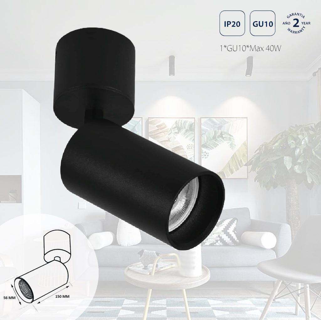 LAMPARA DE TECHO NEGRA 1XGU10 diseño integral simple y elegante sin caja de controlador y sin tornillos visibles, ideal para aplicaciones minoristas, cuerpo de aluminio fundido, disipador térmico de enfriamiento pasivo. Con medidas de 56*150 milimetros. Base GU10, dirigible y voltaje de 110-240V 50-60Hz. Tono de color Negro. No incluye Bombillo