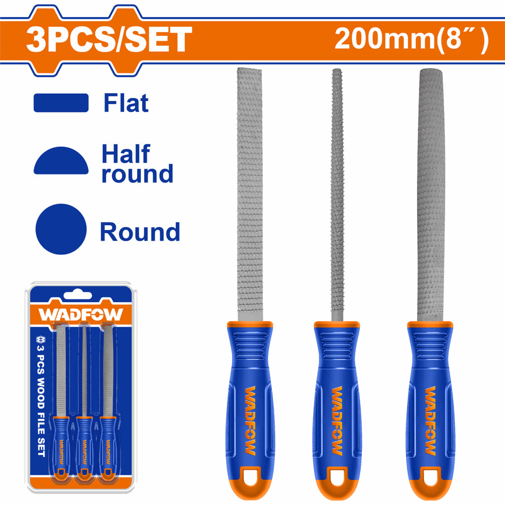 | Características | Limas para madera. Plana, redonda y media caña. Largo 8"mm. Acero T12. Set de 3 piezas. |