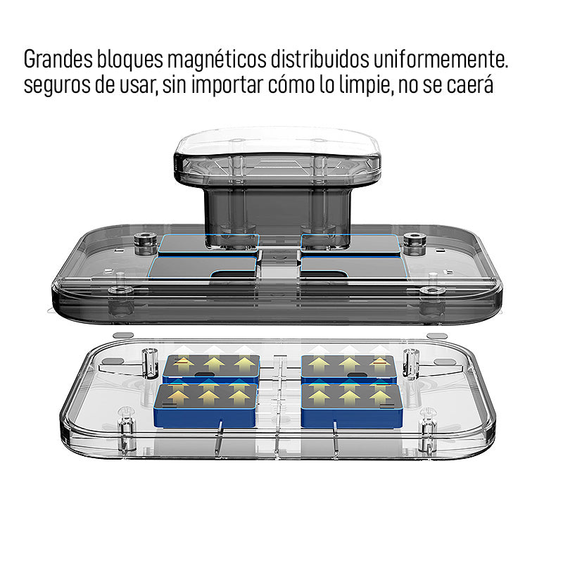 -Solo se debe unir cuidadosamente ambas piezas, una de cada lado de la superficie a limpiar, para que se conecten los imanes y listo.