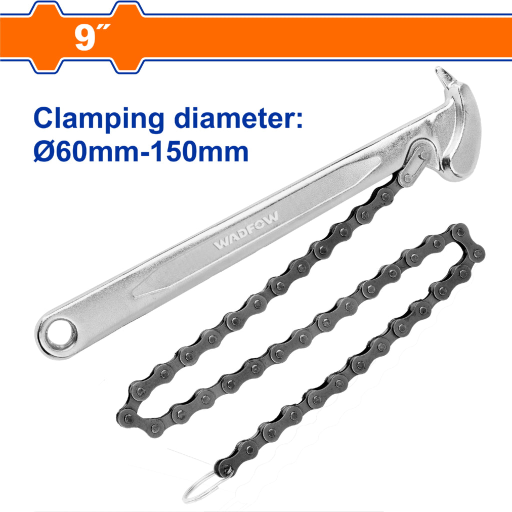 | Características | Llave de Cadena de 9", Diámetro de Sujeción 60-150 Mm, Longitud de cadena 520 mm, Mango Forjado, Tratamiento Térmico, Cromado, |
