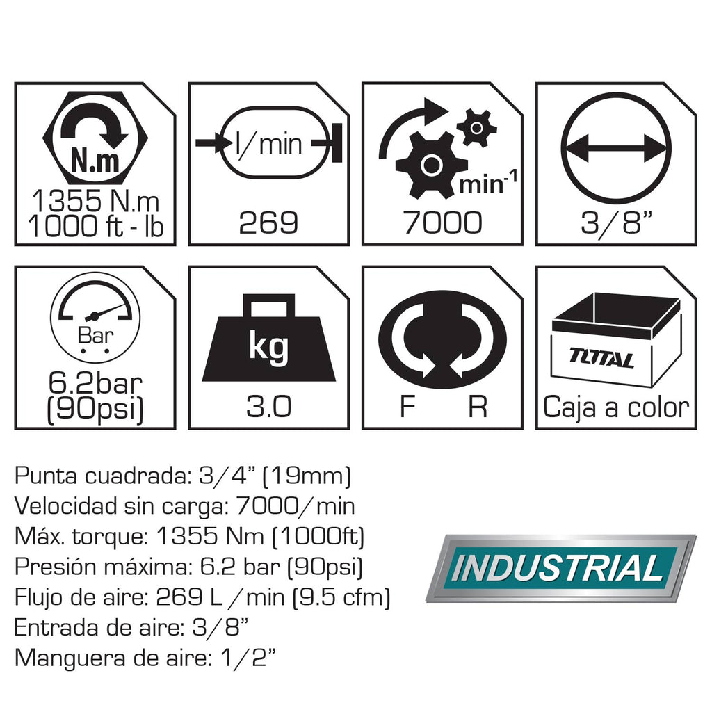 Llave De Impacto Neumática 3/4" No-Load Speed:7000 Rpm Max.Torque:1355Nm(1000Ft) (1 Año)