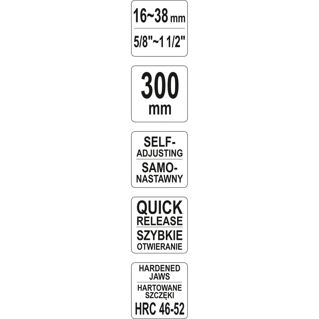 DE TRABAJO: 16- 38MM (5/8''''- 1,5''''), MANDÍBULAS TIPO GANCHO, 3 PUNTOS DE CONTACTO CON TORNILLO, LONGITUD TOTAL: 30CM, ANCHO DE MANDÍBULAS: 14MM, MATERIAL DE LAS MANDÍBULAS: ACERO #45, MANDÍBULAS ENDURECIDAS: TRATAMIENTO TÉRMICO EN HORNO DE CINTA DE MALLA DE ALAMBRE, DUREZA DE LAS MANDÍBULAS: 46- 52 HRC, LAS MORDAZAS CARGADAS POR RESORTE PERMITEN TRABAJAR COMO TRINQUETE, ACABADO: ÓXIDO NEGRO CON IMPRESIÓN LÁSER CON LOGOTIPO DE YATO, MANGO DE PLÁSTICO DE 2 COLORES, PESO: 573G