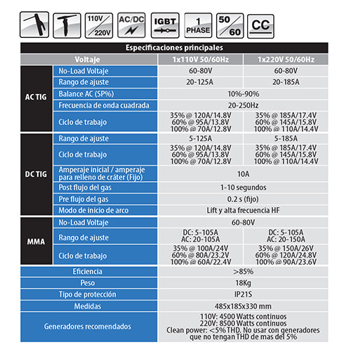| Ciclo de Trabajo AC TIG | (1x110V 50/60Hz)=35% @ 120A/14.8V ; 60% @ 95A/13.8V ;100% @ 70A/12.8V;(1x220V 50/60Hz)=35% @ 185A/17.4V; 60% @ 145A/15.8V; 100% @ 110A/14.4V |