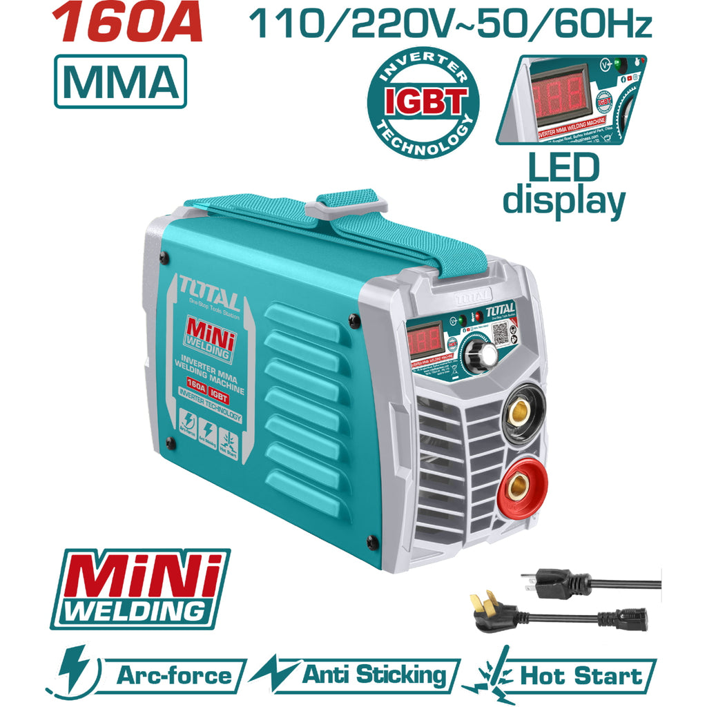 Soldador Inverter MMA. Voltaje de Entrada 110-120/220-240. Frecuencia 50/60Hz. Corriente de Salida (A) 110-120V 10-130A. Corriente de Salida (A) 220-240V 10-160A. Ciclo de Trabajo (%) 110-120V 130A@40%. Ciclo de Trabajo (%) 220-240V 160A@40%. Voltaje (V) 75. Corriente Max. de Salida (A) 160. Diámetro de Electrodo (mm) 1.6-4.0. Trae 1 Porta electrodo con Cable. Trae 1 Abrazadera de Tierra con Cable. Trae 1 Cepillo de Alambre. Trae 1 Careta Protectora y 1 Cable de Extensión.''