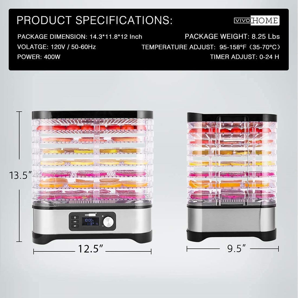 •MATERIAL PREMIUM: hecho de una base de acero inoxidable y bandejas de plástico premium, todos los materiales están libres de BPA y son absolutamente seguros para su salud; La pantalla de visualización LED digital le permite programar y controlar con precisión los ajustes de temperatura; Disfruta de un refrigerio casero fácil y saludable sin aditivos.