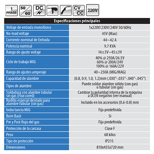 | Rango de ajustes amperaje | 40~250A (MIG/MAG) |
