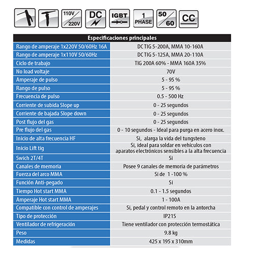 | Rango de ajuste DC TIG | DC TIG 5-200A ; DC TIG 5-125A |