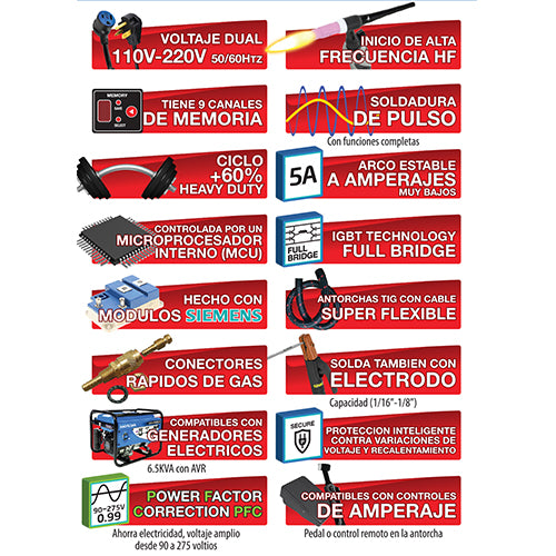 | Características 2 | PFC (Power factor Corrección) Ahorra electricidad, voltaje amplio desde 90 a 275 voltios; Soldadura de pulso con funciones completas; Antorcha TIG con cable super flexible; Protección Inteligente contra variaciones de voltaje y recalentamiento |