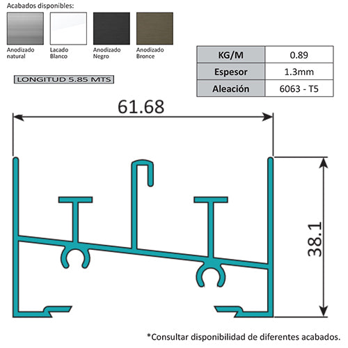 Marco Inferior Ventana VC . Espesor 1.27 mm. Largo 5.85 mts. Acabado Anodizado Silver 15 Micron VC122