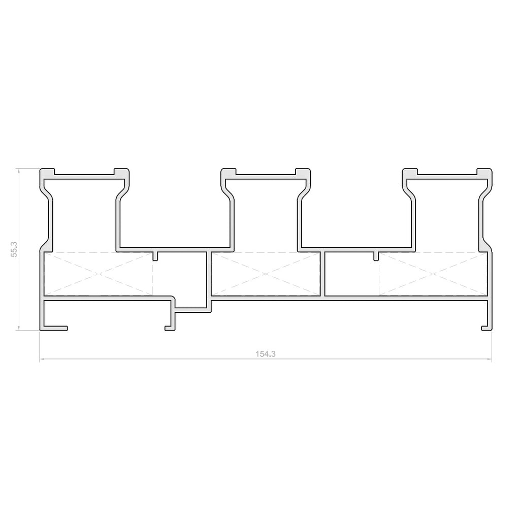 Marco Perimetral 3 Carriles. Serie Elevable Europa. Color Negro. Dimensiones de 155x55 mm. Espesor 1.5 mm. Largo 5.85 m