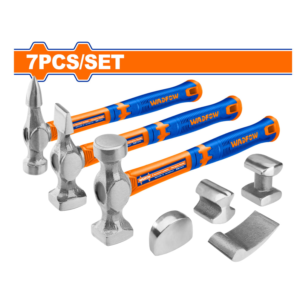 | Características | Martillos para Chapistería. 7 pzs. Tratamiento térmico. Mango de Fibra de Vidrio. Acero al Carbono # 45 (Incluye martillos y dollies) |