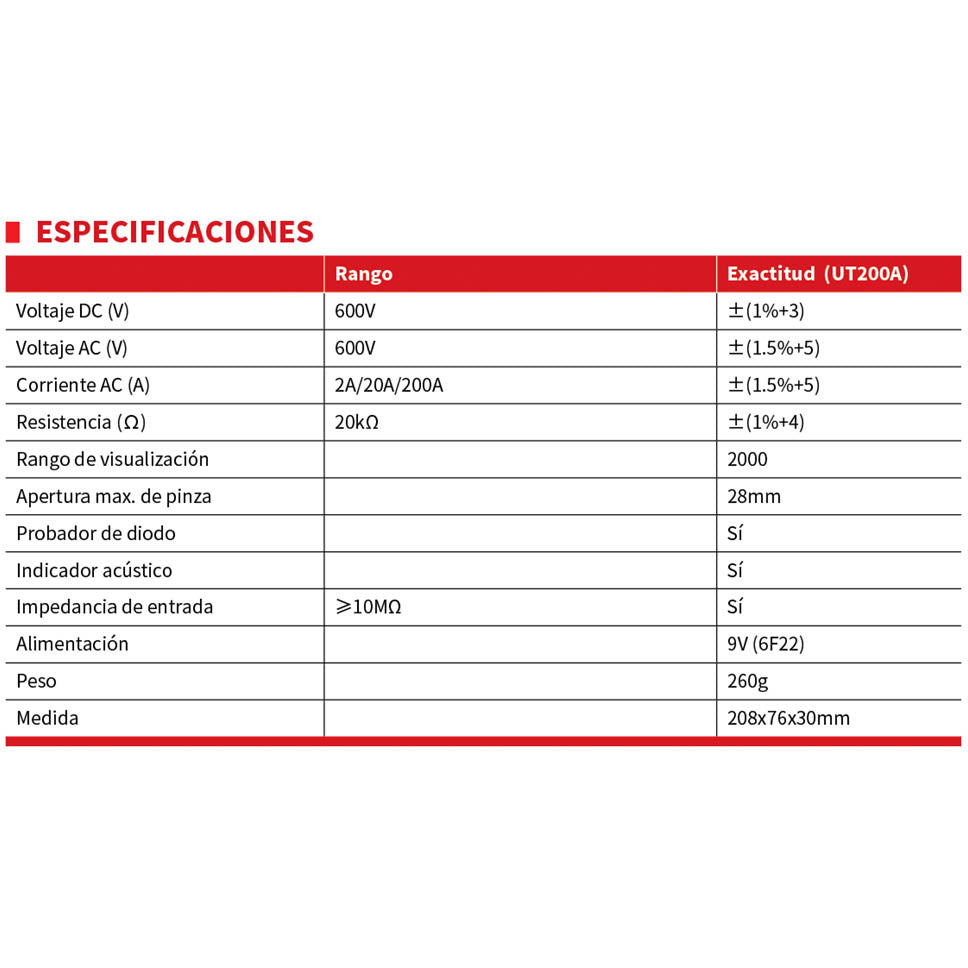 Pinza amperimétrica UT200A es una herramienta diseñada para medir voltaje AC/ DC, corriente AC, resistencia, realizar chequeo de diodos y verificar continuidad de circuitos.