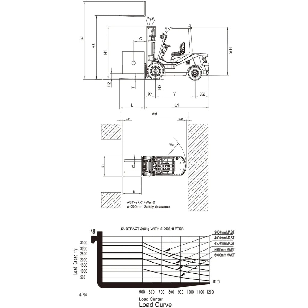 | Especificaciones | Ángulo de Inclinación del Mástil (F/R, a°/β°) 6°/12° Sobresaliente de las Horquillas 479mm Sobresaliente Trasero 520mm |