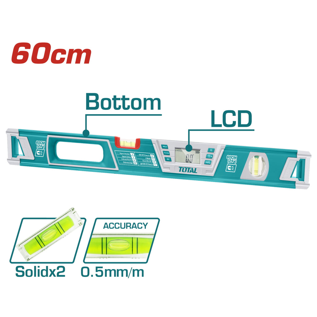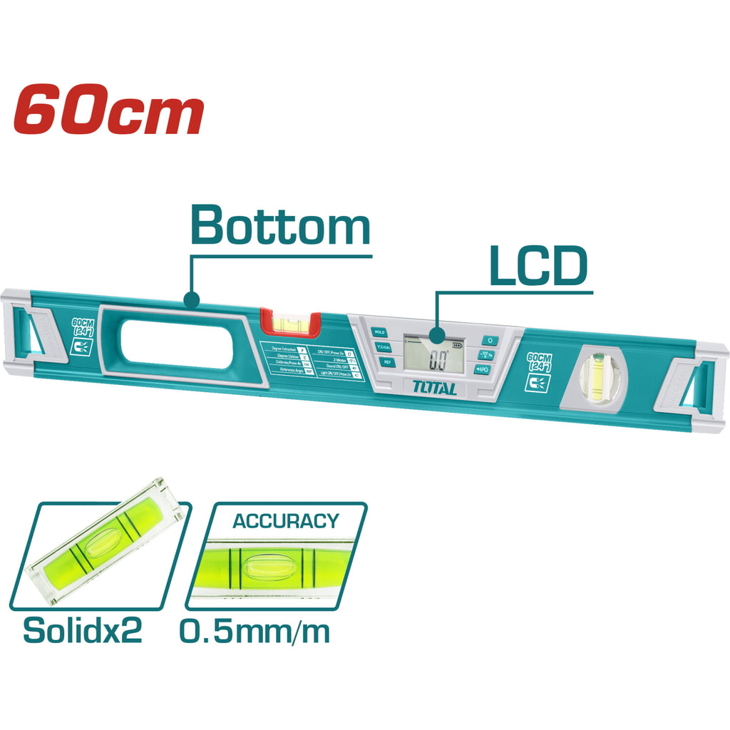 Nivel de burbuja digital, Aluminio 1.5mm de espesor, Longitud: 60 cm, Rango de medición: 0 ~ 360 ° (4 x 90 °), Precisión de medición: ± 0,2, Imanes potentes de 3 piezas. Presentación caja color.