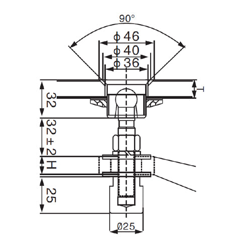 Perno de araña avellanado 46 mm. Perforacion en vidrio de 37 mm.