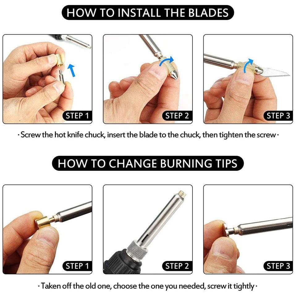 Este juego de herramientas ha sido diseñado para dar excelentes resultados cuando se trabaja en madera o cuero. Además, se puede utilizar para transferencia de imágenes, corte de encofrado, soldadura, estampado en caliente y grabado textil.