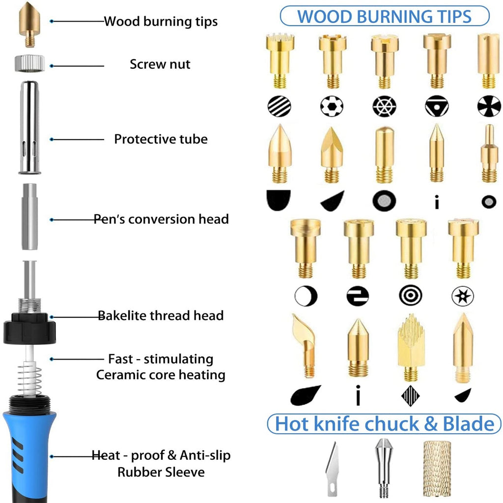 El mango ligero y ergonómico del juego de quemado te permite operarlo en diferentes ángulos, sin fatiga. La funda protectora de alta temperatura te protege mientras trabajas en el proyecto de pirografía (por horas), sin sudoración.