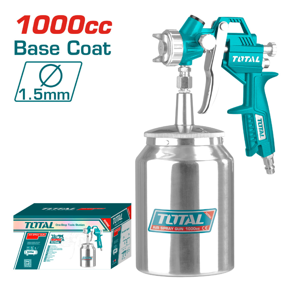Pistola de aire para pintar. Boquilla 1.5 mm. Ancho de spray regulable entre 140-180 mm. Capacidad 1000cc. Usado para capa base. Presion opertiva 3-4 bar. Consumo 4.2-7.1cfm