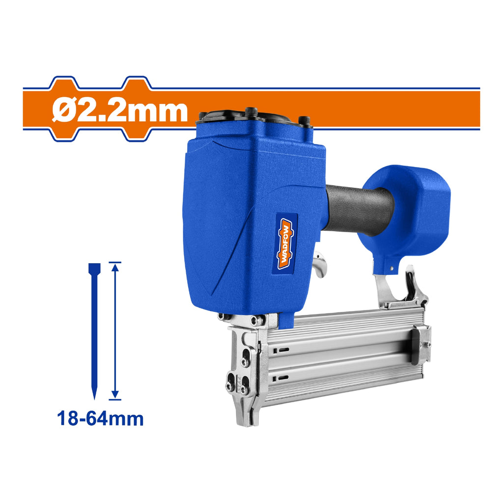 | Características | Capacidad de carga: 70 piezas. Longitud de los clavos: 18-64 mm. Diámetro de los clavos: 2.2 mm. Presión de operación: 5-8 bar (75-116 Psi). |