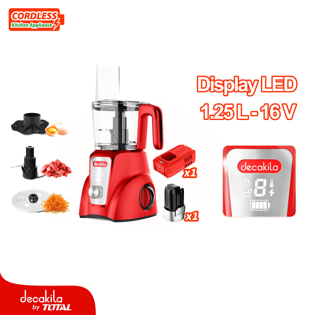 Procesador de alimentos inalámbrico rojo 250W 1.25L Pica, rebana y corta. Incluye Batería y Cargador.