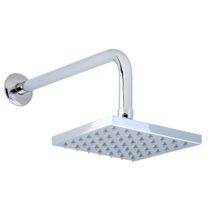 Regadera de plato cuadrada con brazo y chapetón. Cuerpo y brazo en latón . Acabado cromo. Trabaja a baja presión (0.2 a 1 kg/cm2). Garantía de 3 años sobre defectos de fabrica