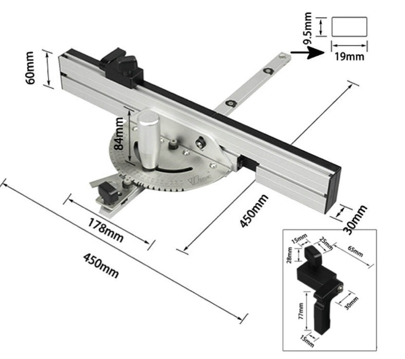 La escala Vernier permite ajustes de ángulo rápidos de 1/10 grados. Nuestra barra de aluminio anodizado extremadamente recta de 18 pulgadas (450mm) es de 3/8 pulgadas (9,5mm) de espesor por 3/4 pulgadas (19mm) ancho y cuenta con cinco ajustadores de barra que puedes usar para eliminar ''play'' en la ranura de inglete con el giro de un destornillador.