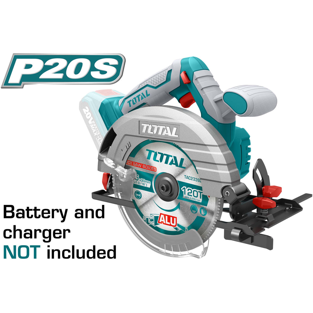 Sierra Circular de Batería de Litio 20V. Velocidad 4600 rpm. Capacidad de Corte a 45°: 38mm. A 90°: 55mm. Profundidad de Corte Ajustable. Bisel de Corte Ajustable. Incluye Disco de Corte de 165mm. No incluye Batería ni Cargador.