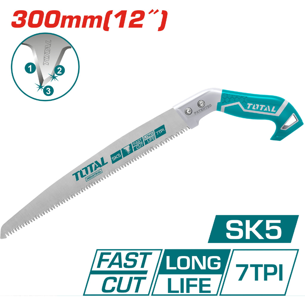 Sierra para Podar 12'' / 300 mm. Sk5 / 7 TPI. Dientes Triples Rectificados de Precisión (3 bordes) con tratamiento térmico de larga duración. Capaz de realizar un corte rápido y con precisión.