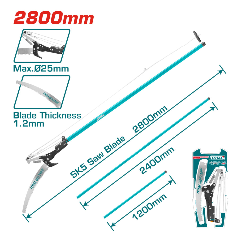 Sierra para Podar 25mm. Sk5 Dientes Triples Rectificados de Precisión (3 bordes). Barra telescópica de acero extensible en dos partes hasta 2.8m. Hilo de nilón de 2.7m y 1.2mm de diámetro. Diseño de doble rueda. Sierra pintada con teflón y tratamiento térmico. Presentación blíster.