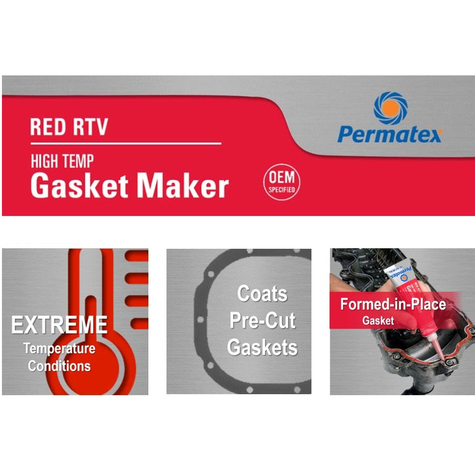 • El fabricante de juntas de silicona RTV de Permatex High-Temp Red está formulado para aplicaciones de alta temperatura y uso de alta resistencia, como remolque. Rango de temperatura: -65 °F a 650 °F (-54 ºC a 343 °F) intermitente. Cuando se utiliza una junta de corte, Permatex High Temp Red RTV Silicone se puede utilizar para cubrir la junta precortada para aumentar la fiabilidad. Este compuesto de junta RTV de un solo componente cura la exposición a la humedad en el aire para formar una junta de goma de silicona resistente, flexible.